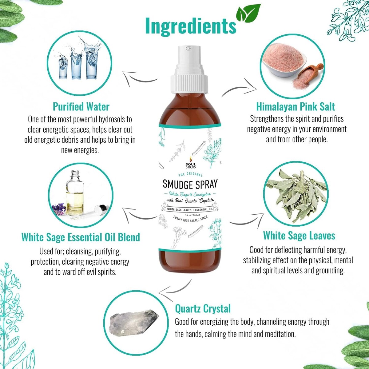 SMUDGE SPRAY: Each bottle of smudge spray contains real white sage extract. You can expect the same quality cleansing potential from a simple spray as you can from burning a full inch of white sage smudge stick.