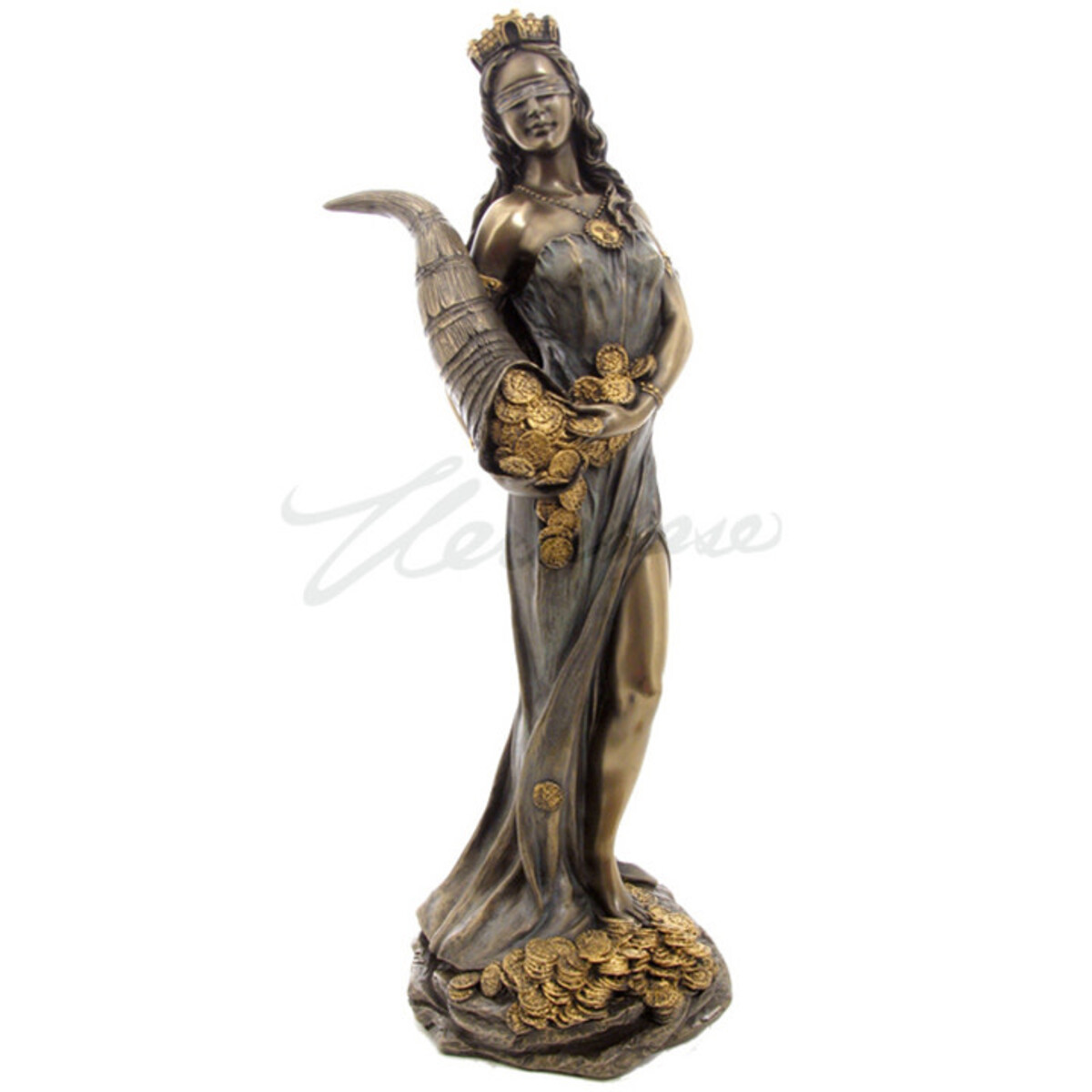 Fortuna was the Roman goddess of fortune, chance, and prosperity, and one of the most popular Roman deities during the period of Servius Tullius. She was the Roman adaptation of the Greek goddess of fortune, Tykhe. Other names of Fortuna were: Primigenia, Virilis, Respiciens, Muliebris, and Annonaria. She is usually portrayed standing, blindfolded, wearing a rich dress. Holding either the cornucopia, rudder, ball, or wheel of fortune. This statue is beautifully designed, sculpted and handcrafted to the finest detail in cold cast metal (Bronze/pewter) finish.
