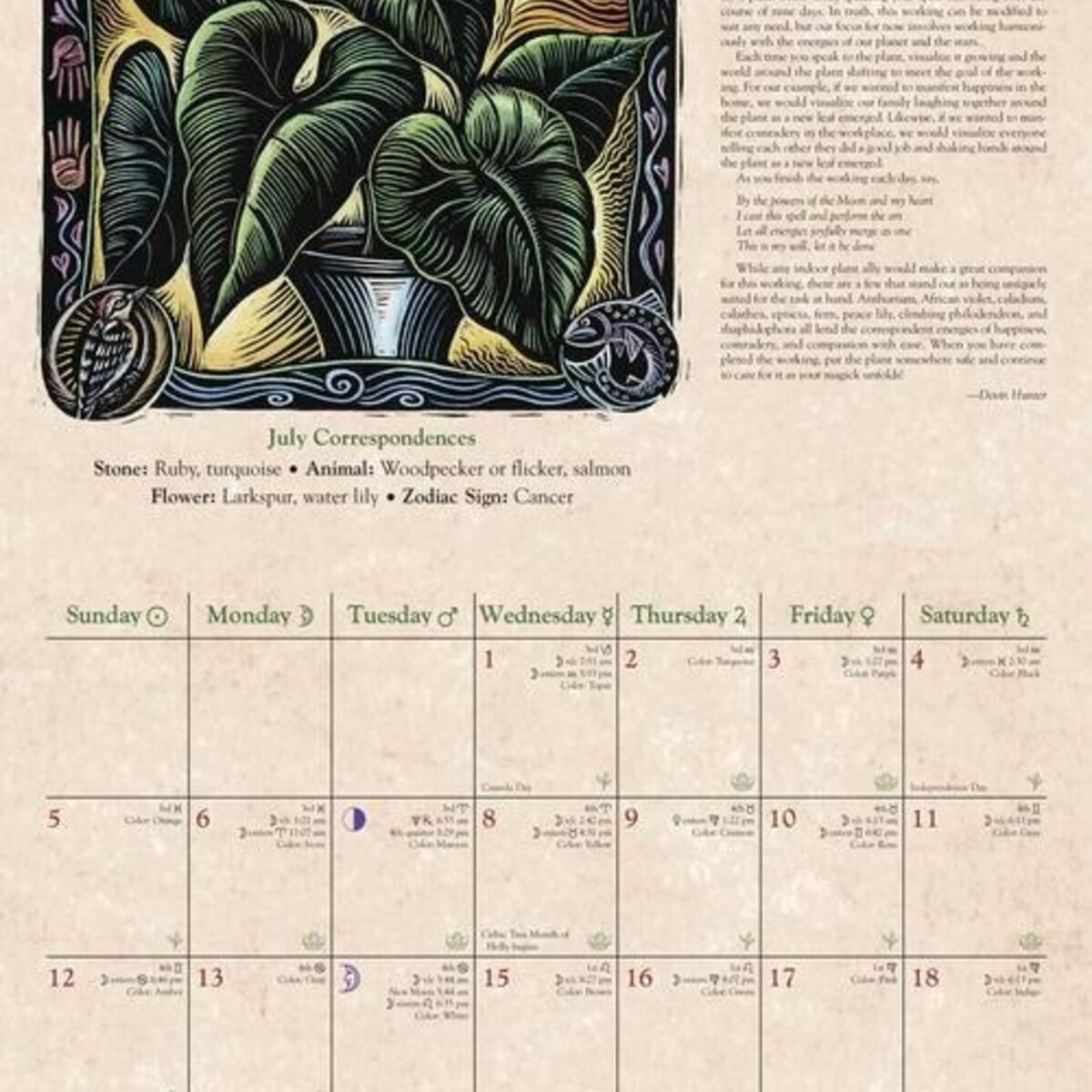 It also includes lunar gardening tips, astrological data, magical correspondences, Moon phases, planting and harvesting days, Celtic tree months, Sabbats, and US and Canadian holidays.
