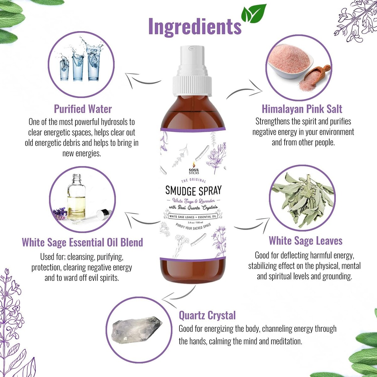 SMUDGE SPRAY: Each bottle of smudge spray contains real white sage extract. You can expect the same quality cleansing potential from a simple spray as you can from burning a full inch of white sage smudge stick.