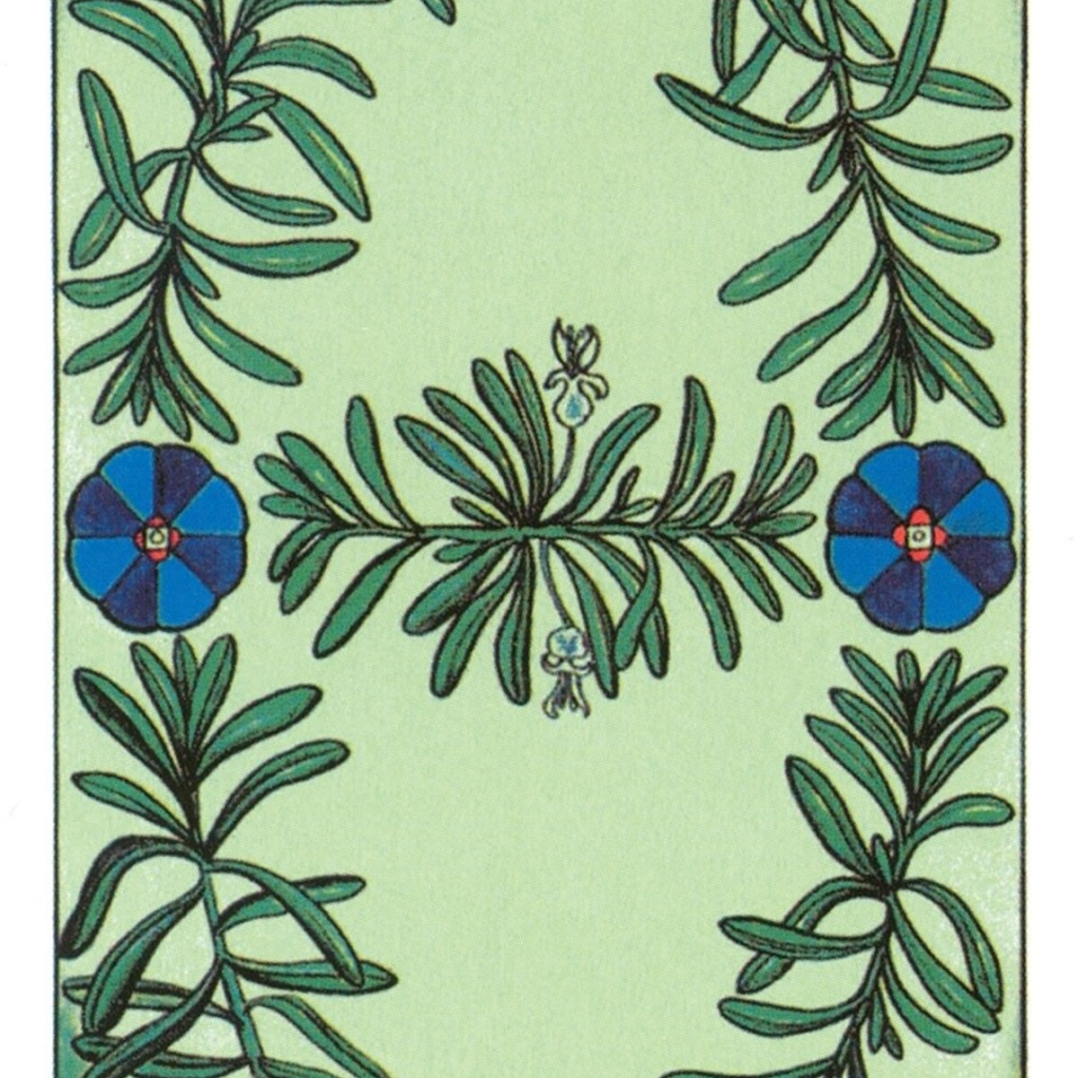 The symmetric card backs feature sprigs of rosemary. The booklet gives both upright and reversed meanings.